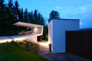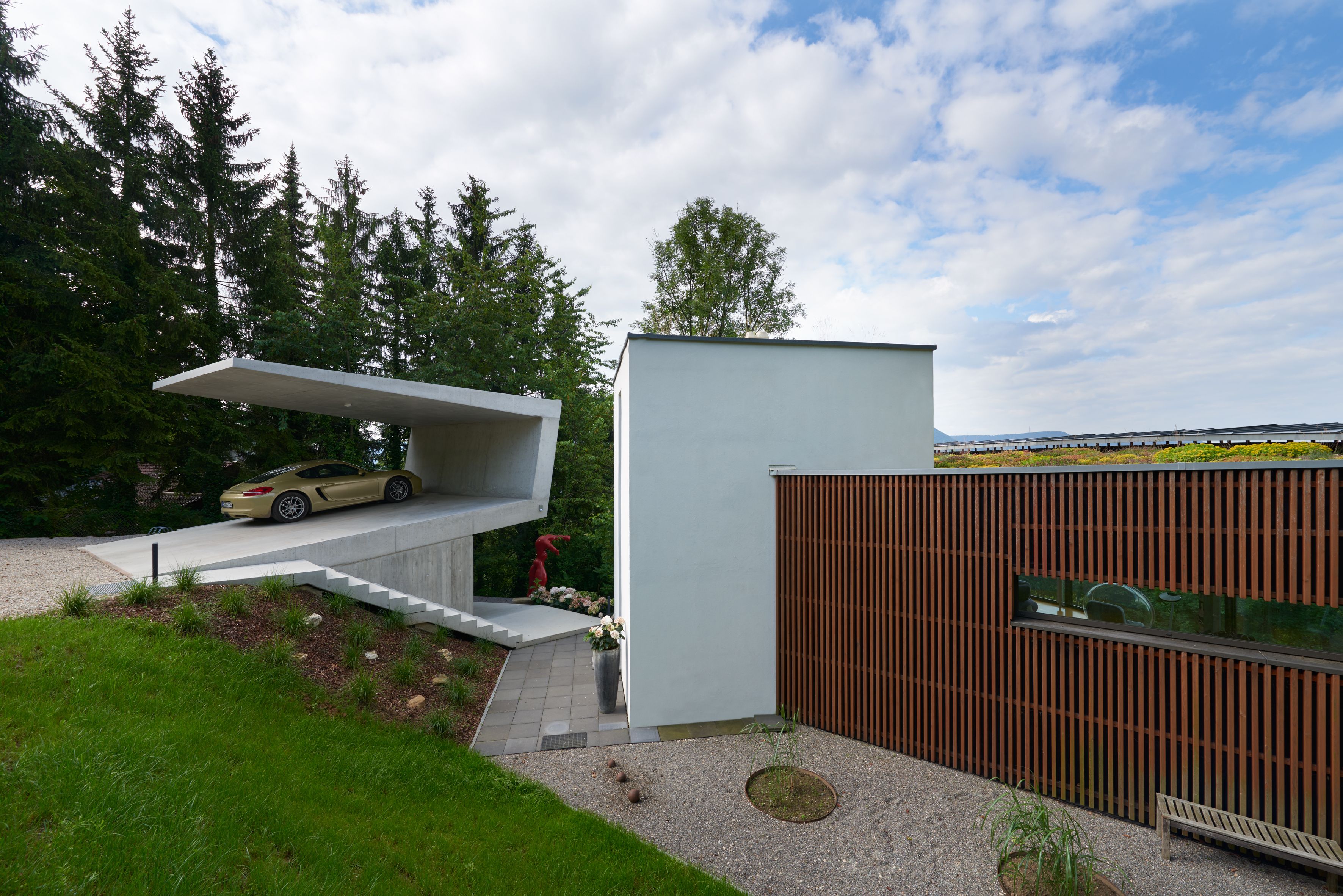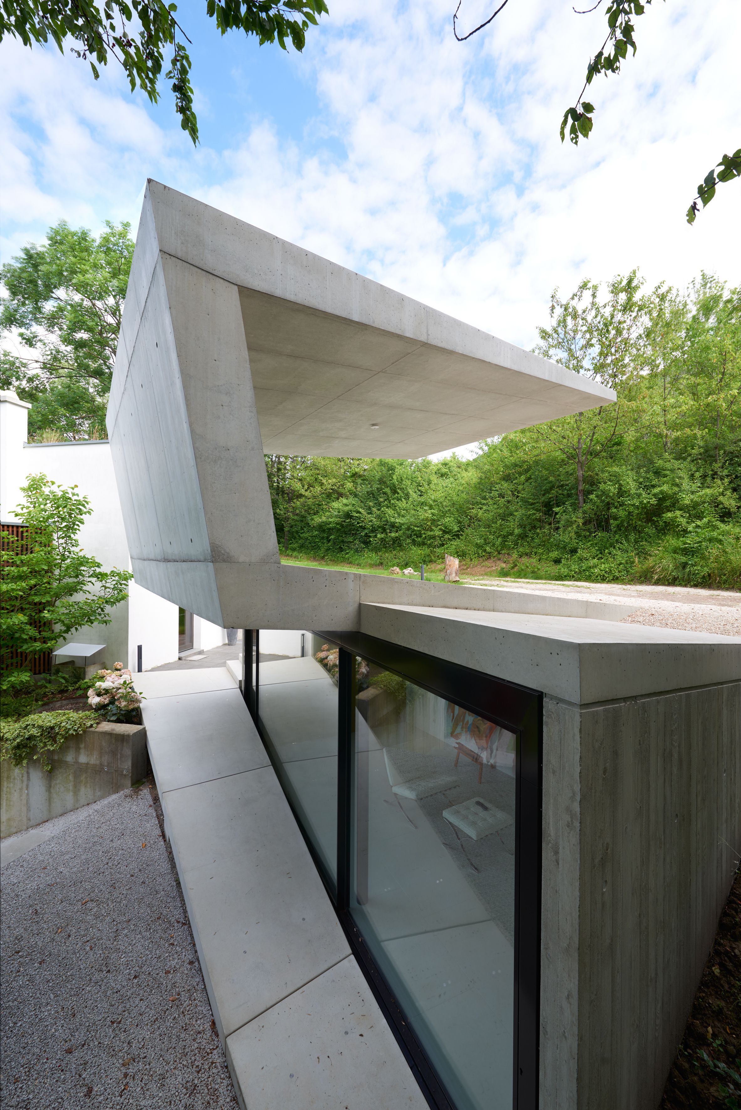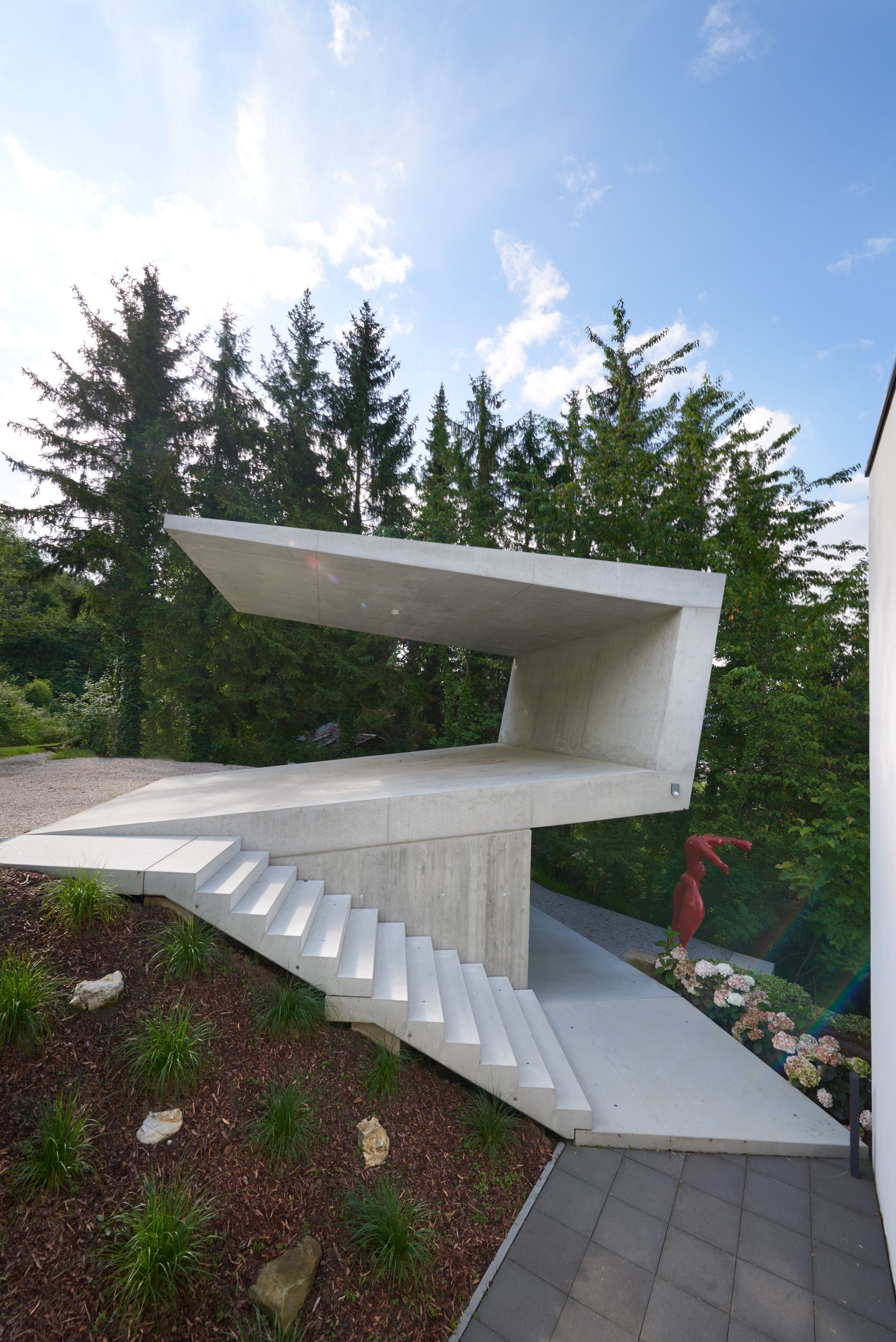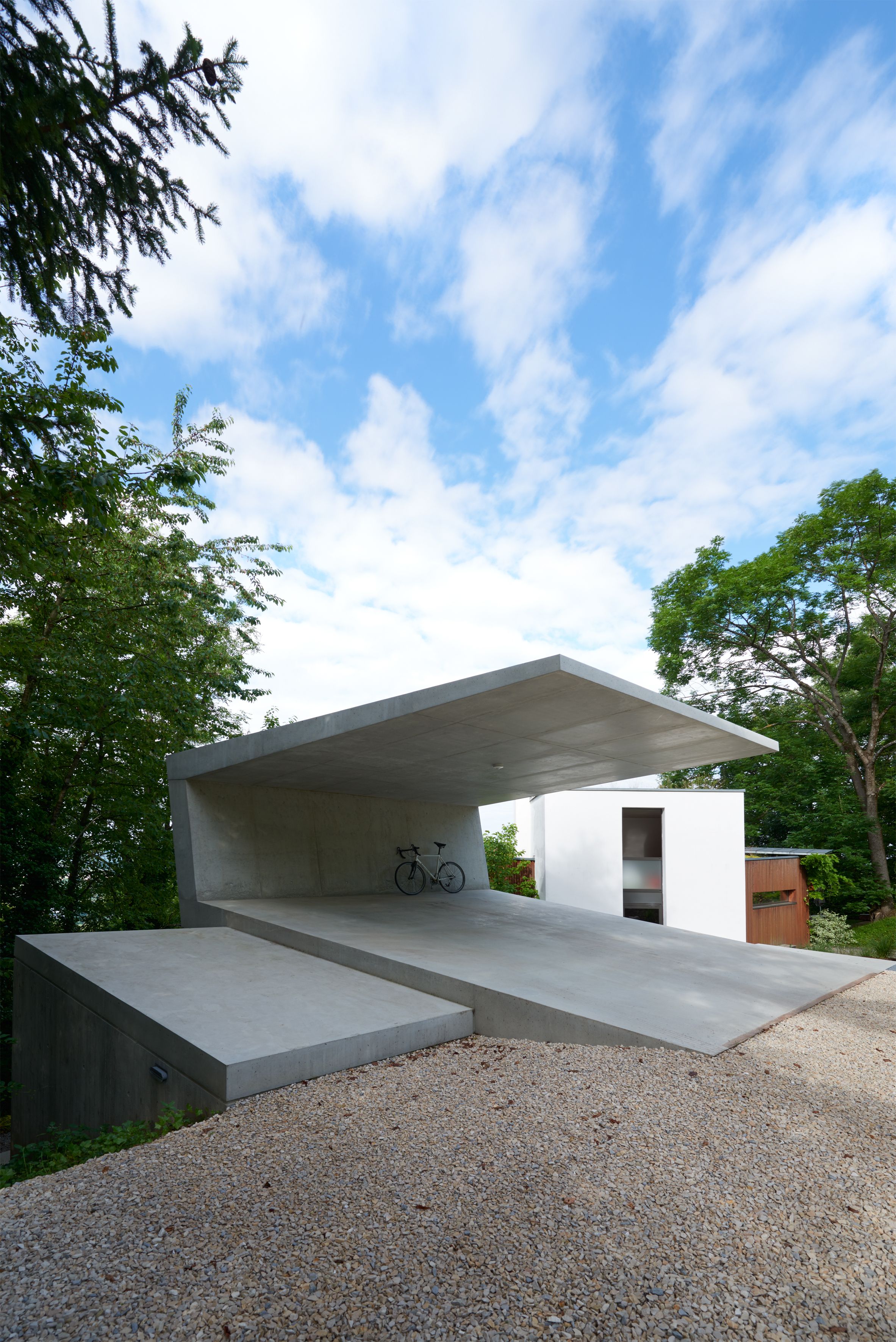 der konkav-konvexe baukörper öffnet und birgt im wechsel zwei funktionen. überdachung und schutzdach für fahrzeuge oben, rückzugsraum für die bauherren und für gäste unten. zum hang nach oben öffnet sich das sich stark verjüngende auskragende dach. zur talseite öffnet sich ein einraum, der von der zufahrtsseite nicht erkennbar bleibt. über treppen und rampen wird das gebäude in den steil abfallenden hang eingewoben. eine begehbare und bewohnbare, scharfkantige skulptur aus beton mit minimalistisch aufs notwendigste reduziertem werkstoffeinsatz.