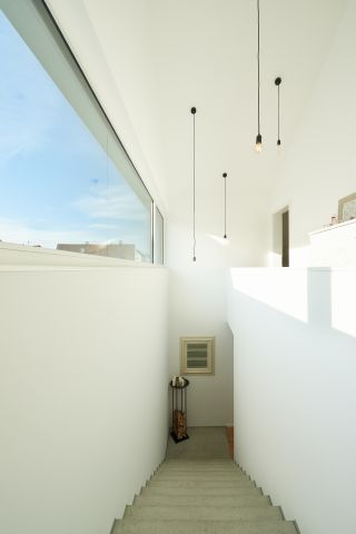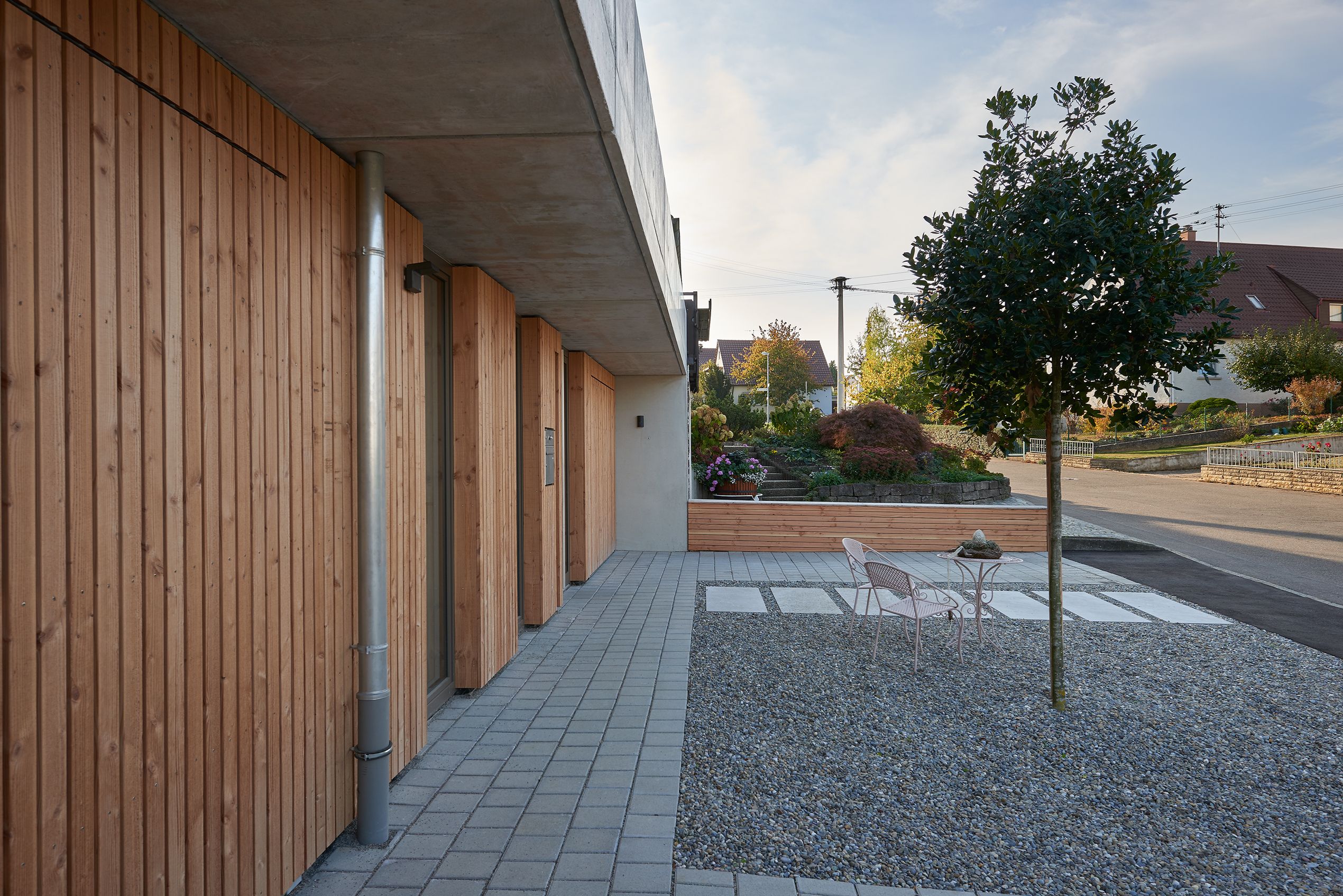 das einfamilienhaus befindet sich auf einem hanggrundstück, besteht aus einem kompakten baukörper auf einem breiten betonsockel. im sockel, neben den garagen und nebenräumen, sind der eingangsbereich und ein arbeitsraum untergebracht, die sich zur straße orientieren. der sockel passt sich in der höhe an die angrenzende bebauung an. darüber sitzt der obere baukörper mit satteldach, vergleichbar mit einem aufgesetzten schmalen „kuchenschnittchen“, in dem die wohnräume untergebracht sind. das erdgeschoss öffnet sich zum garten im süden und zu den östlich gelegenen feldern mit blickbezügen bis zum albtrauf.