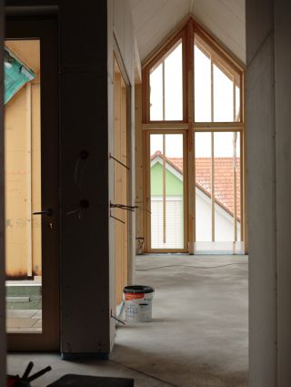 die konstruktion erfolgt in holzbauweise. diese materialwahl prägt das architektonische erscheinungsbild und erfüllt anforderungen an energieeffizienz und nachhaltigkeit.