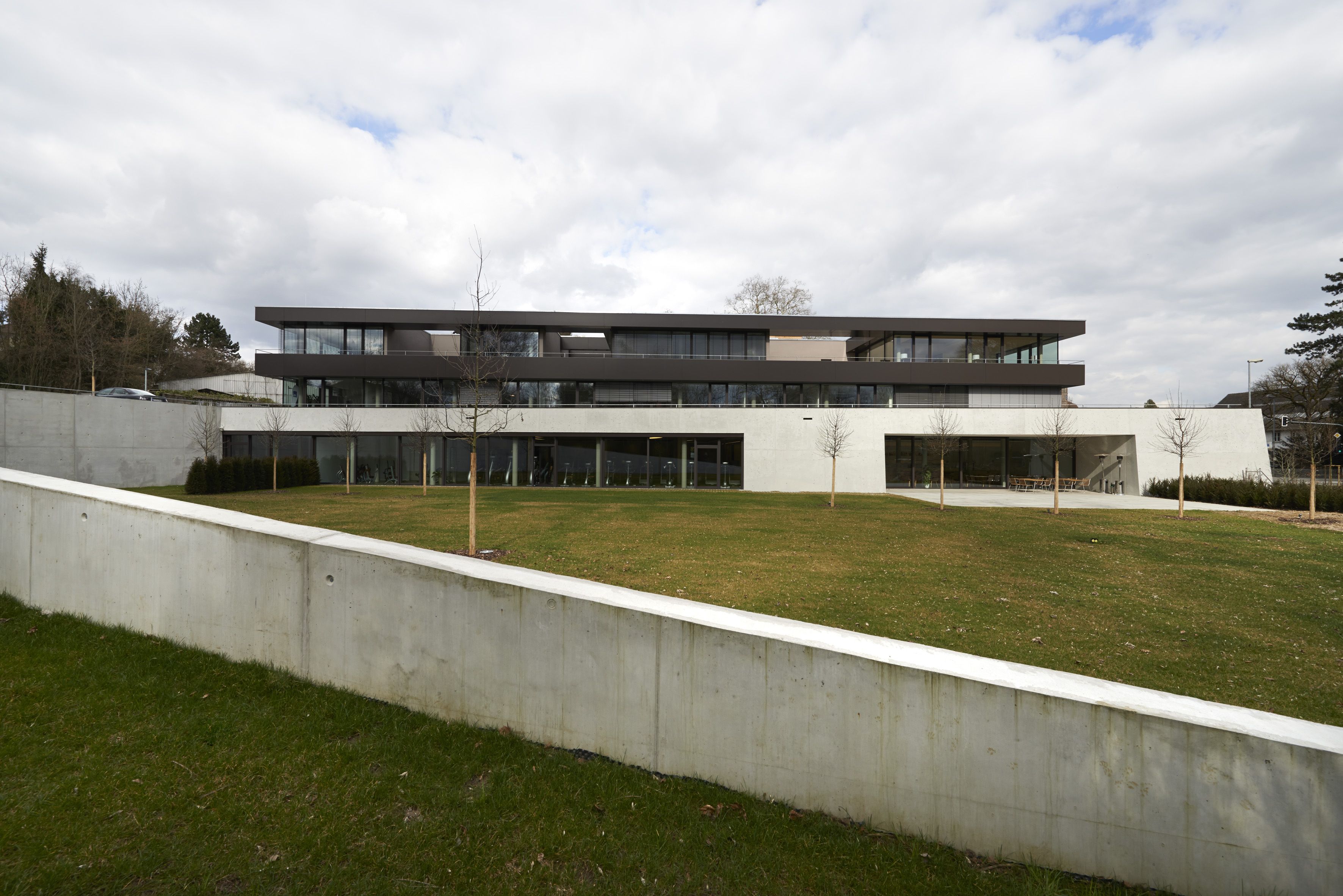 die glasfassaden und aluminiumverkleidungen der obergeschosse bilden einen deutlichen kontrast zum schweren sockel aus dämmbeton. die material- und farbgestaltung des innenausbaus ist auf weiß und graubraun reduziert und harmoniert mit den sichtbetontreppenhäusern.