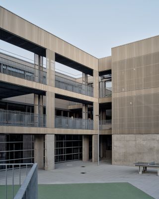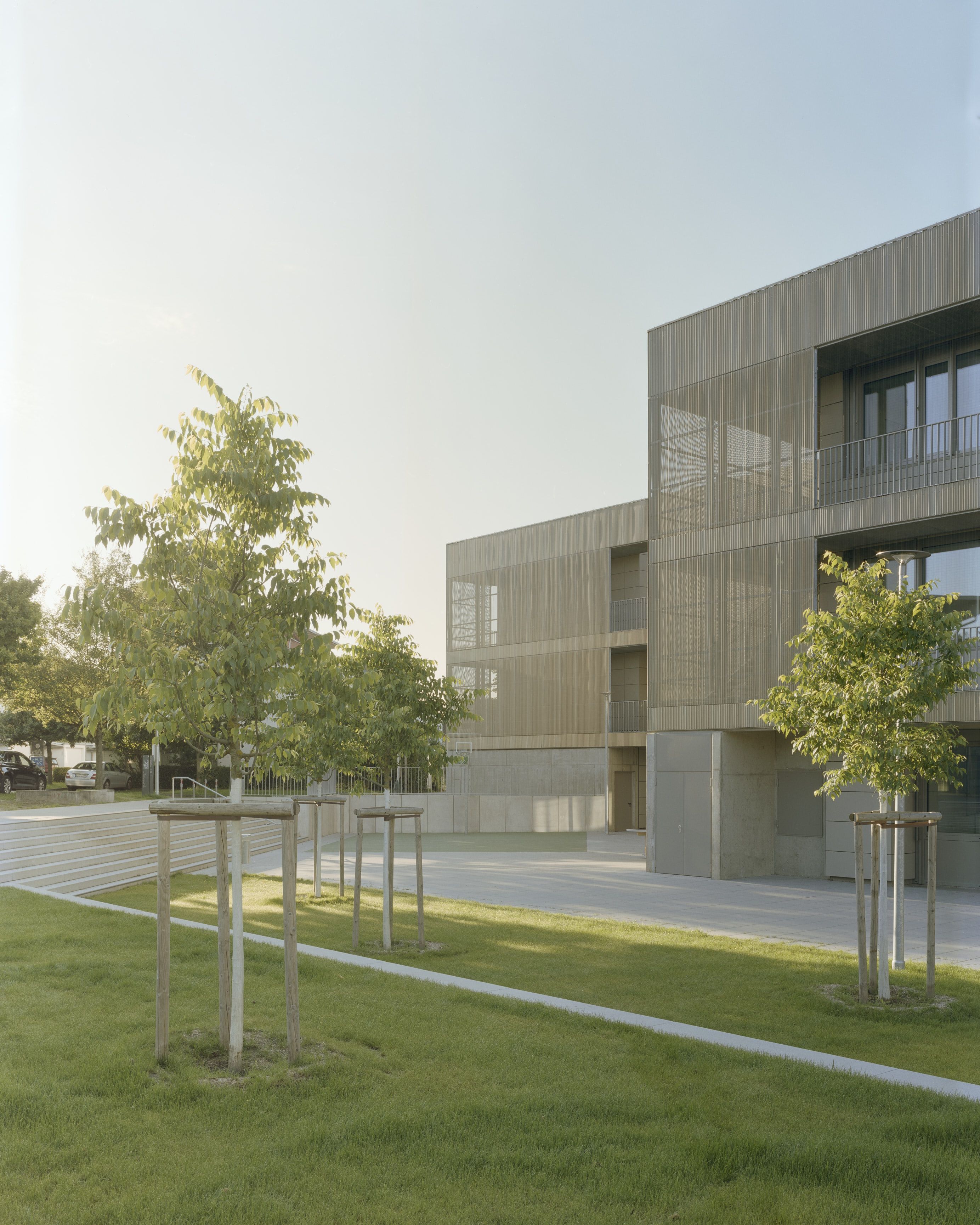 das gesamte schulgebäude aus den sechziger jahren mit dem typischen chic der einschaligen sichtbetonfassade wurde in allen gebäudeteilen gestalterisch und energetisch im laufenden betrieb saniert. eine anpassung der brandschutzanforderungen und fluchtwege erforderte umfangreiche umstrukturierungen und gebäudeanpassungen im inneren des gebäudes. das gebäude erhielt in allen geschossen umlaufende stahlstege.
