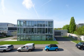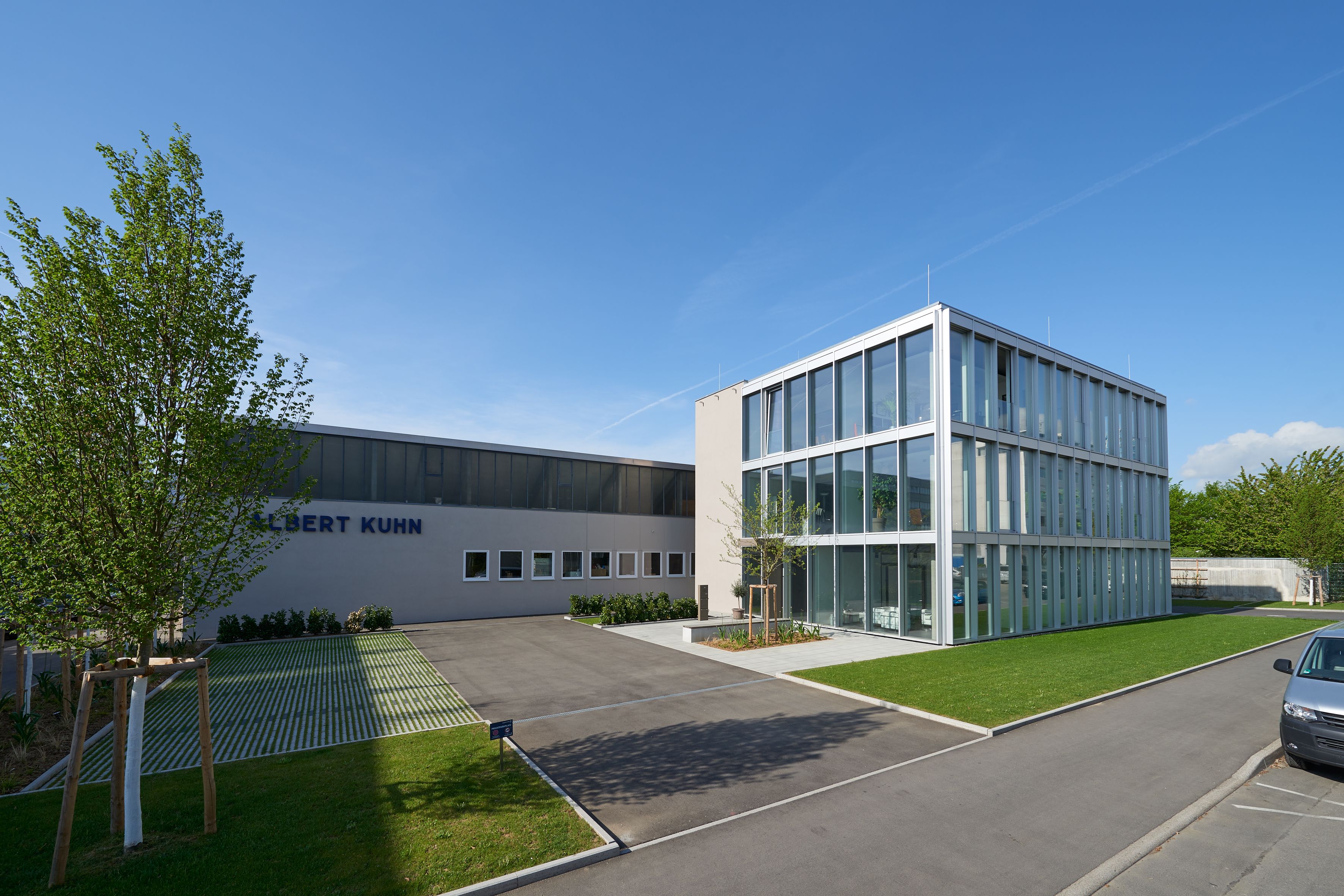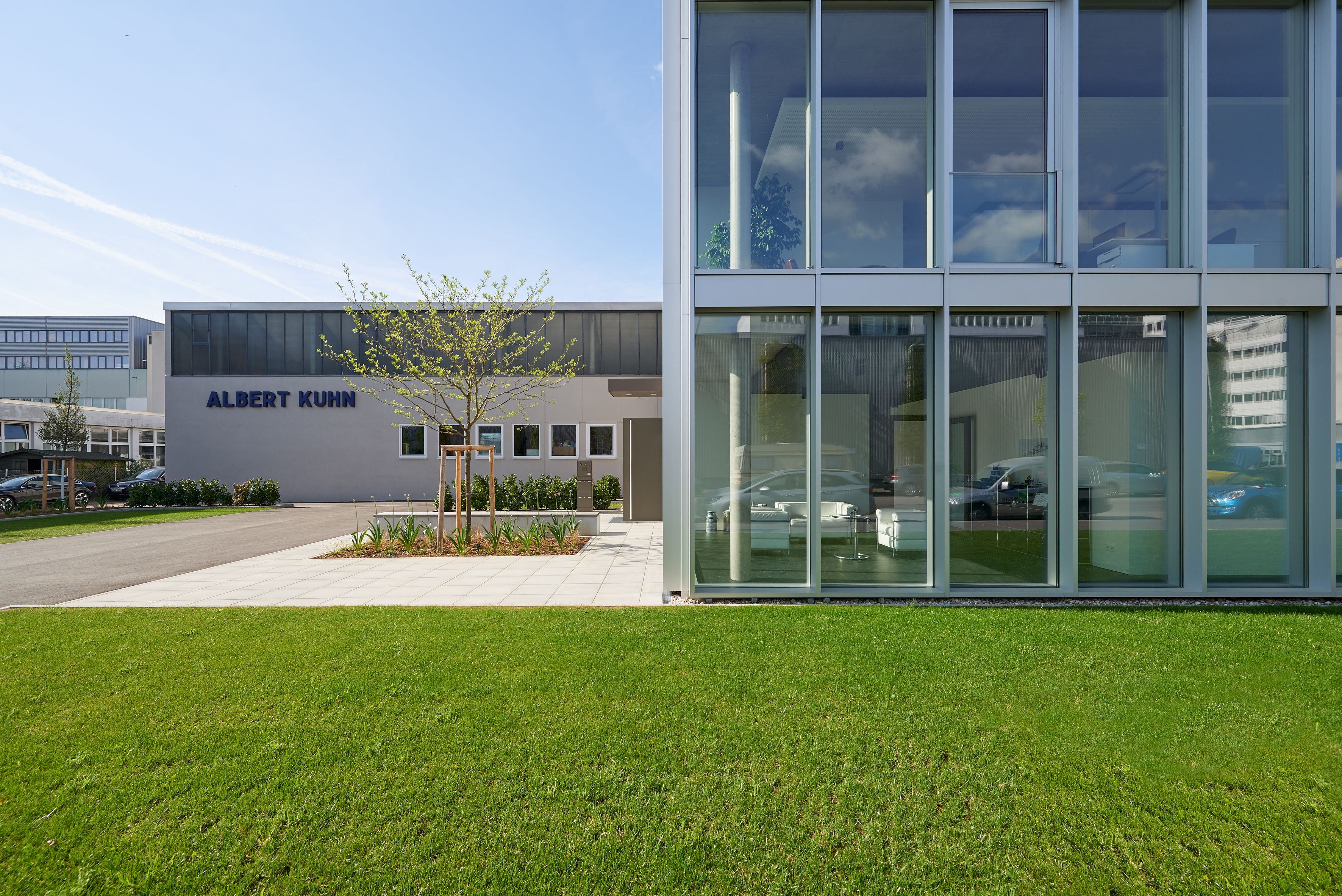 das neue 3-geschossige gebäude der firma albert kuhn gmbh & co. kg entstand im hof des betriebsgeländes neben dem bestehenden, zwischenzeitlich überdimensionierten alten bürogebäude als kompakter, effizienter neubau für die verwaltung. nach fertigstellung und umzug wurde das alte gebäude abgerissen, dadurch entstanden eine großzügige eingangssituation sowie ausreichend platz für parkplätze und grünflächen.