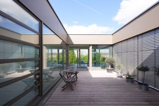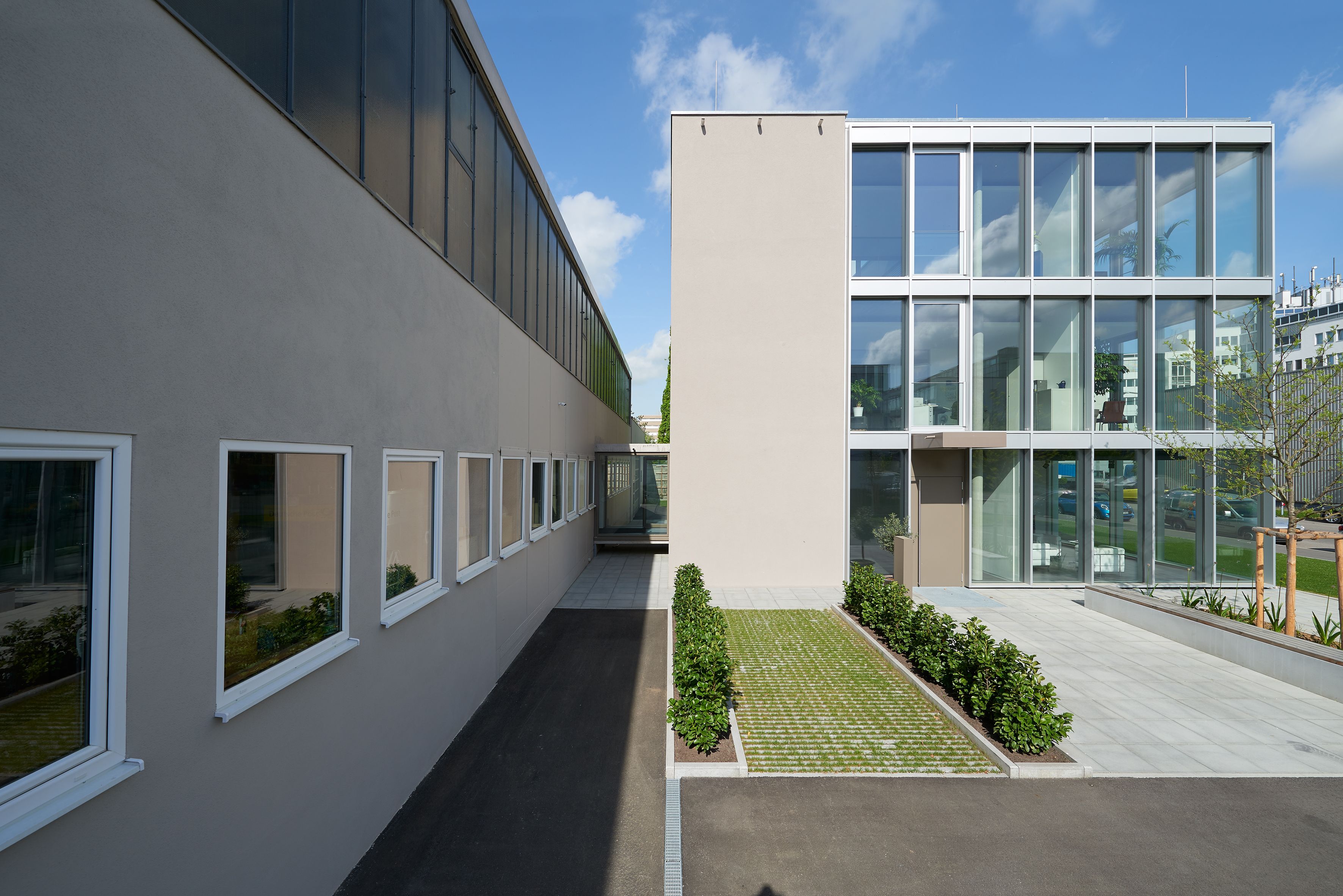 im 2. obergeschoss bietet ein atrium aufenthaltsqualitäten während der pausen, abgeschirmt von lärm des gewerbegebiets und der straße. ein angrenzender lichtspalt in der decke lässt tageslicht vom atrium in das darunterliegende bürogeschoss dringen. über diesen deckenspalt kann die gesamte büroetage auch bei nacht geschützt und dauerhaft be- und entlüftet werden. in der nach außen orientierten fassade sind nur wenige öffnungsflügel notwendig.