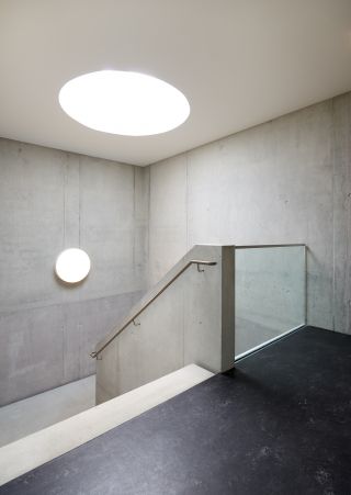 nach norden hin entwickelt sich aus der massiven scheibe heraus ein offener skelettbau, der 3-seitig verglast eingang, büroarbeitsplätze und sozialräume beinhaltet.