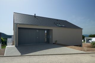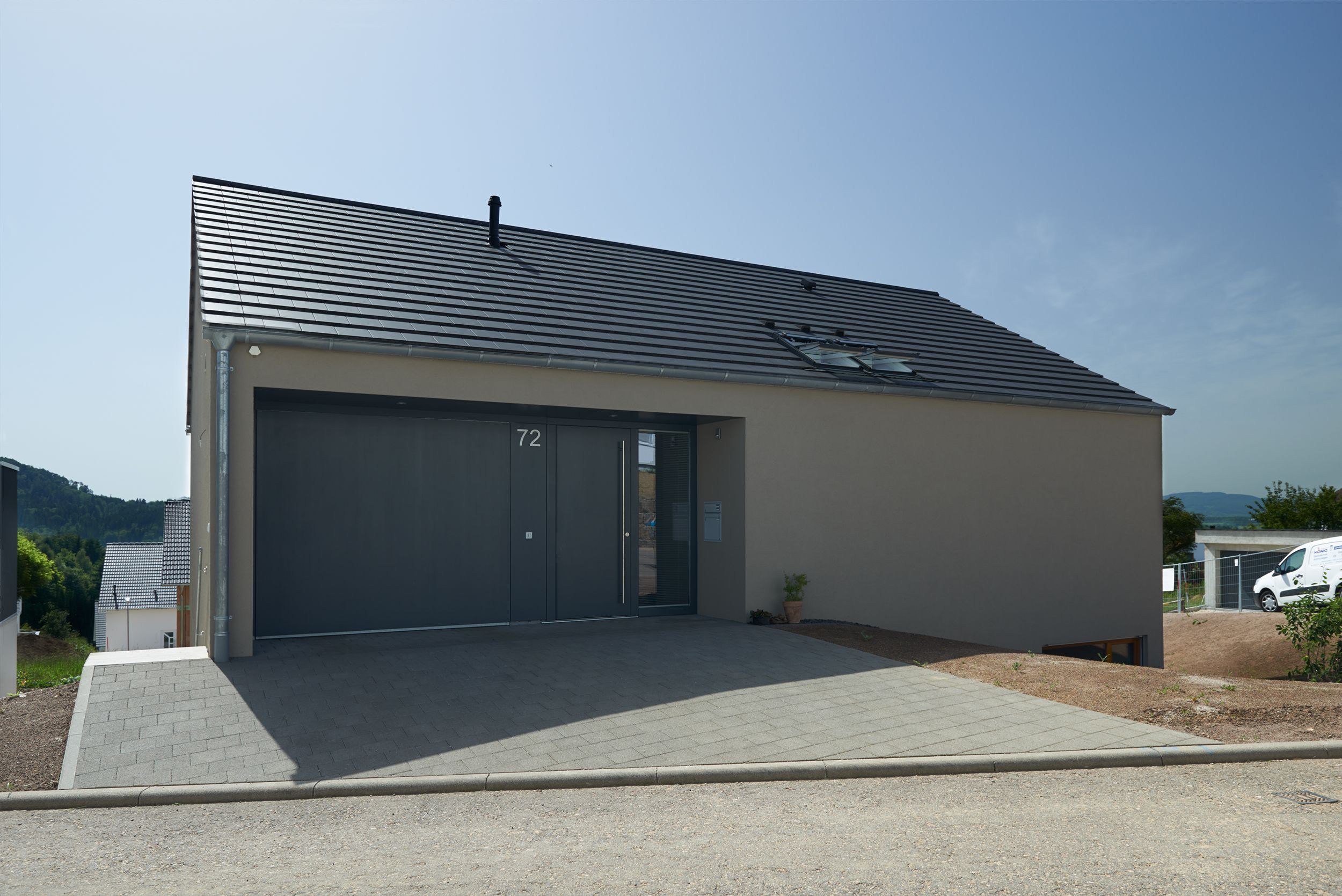 konsequent wird versucht, das gebäude möglichst geduckt in der form an die topographie anzupassen. keine unnötigen architekturelemente bestimmen den baukörper. durch integration der garage wirkt das gebäude äußerlich bescheiden. mit dem zurückspringen der fassade im norden wird der zugang definiert, im süden bildet das hervorspringende obergeschoss mit der loggia einen natürlichen sonnenschutz für das verglaste wohngeschoss darunter.