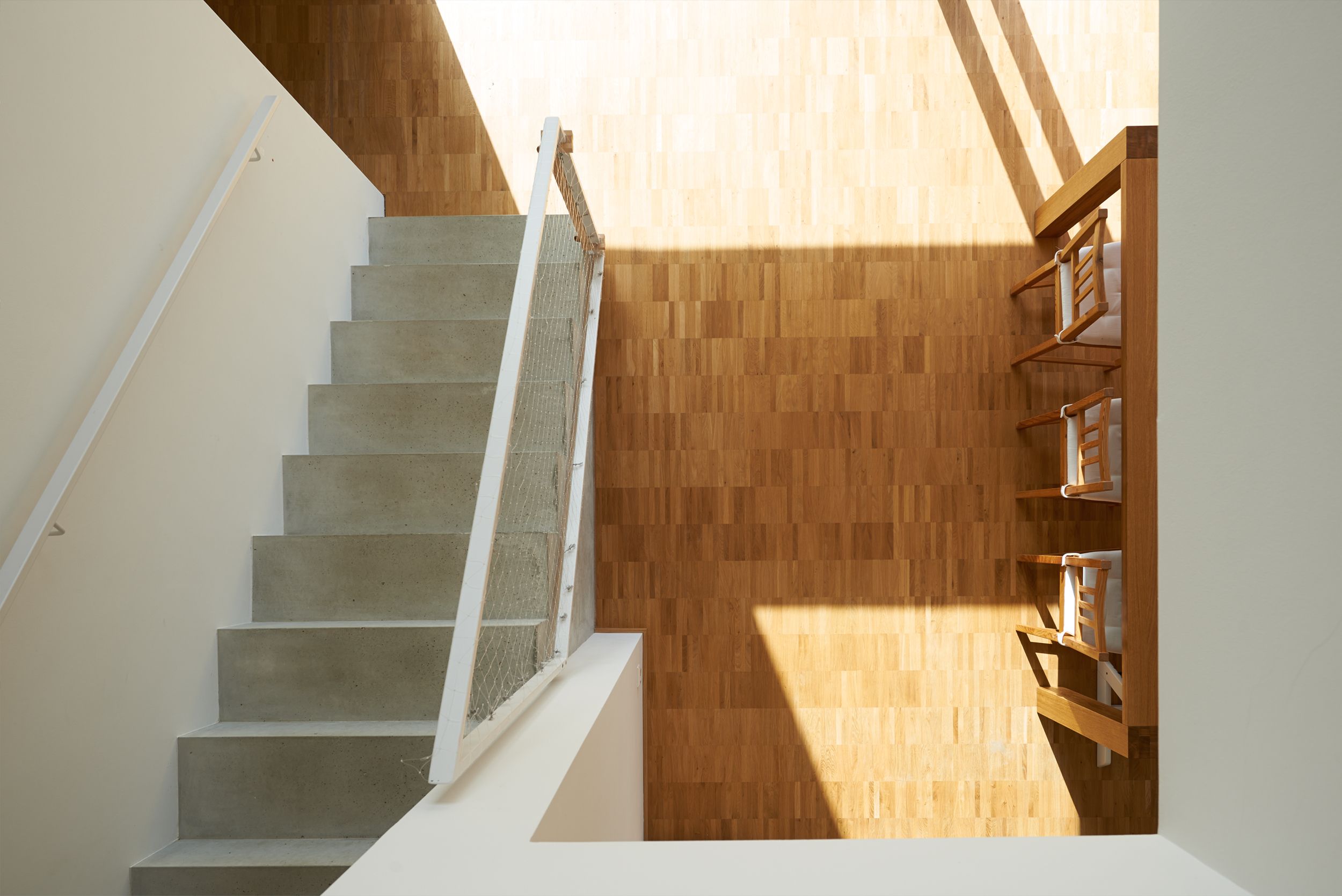 die zweigeschossige treppengalerie verbindet die beiden geschosse im inneren mit großzügigem blick in die umgebung.