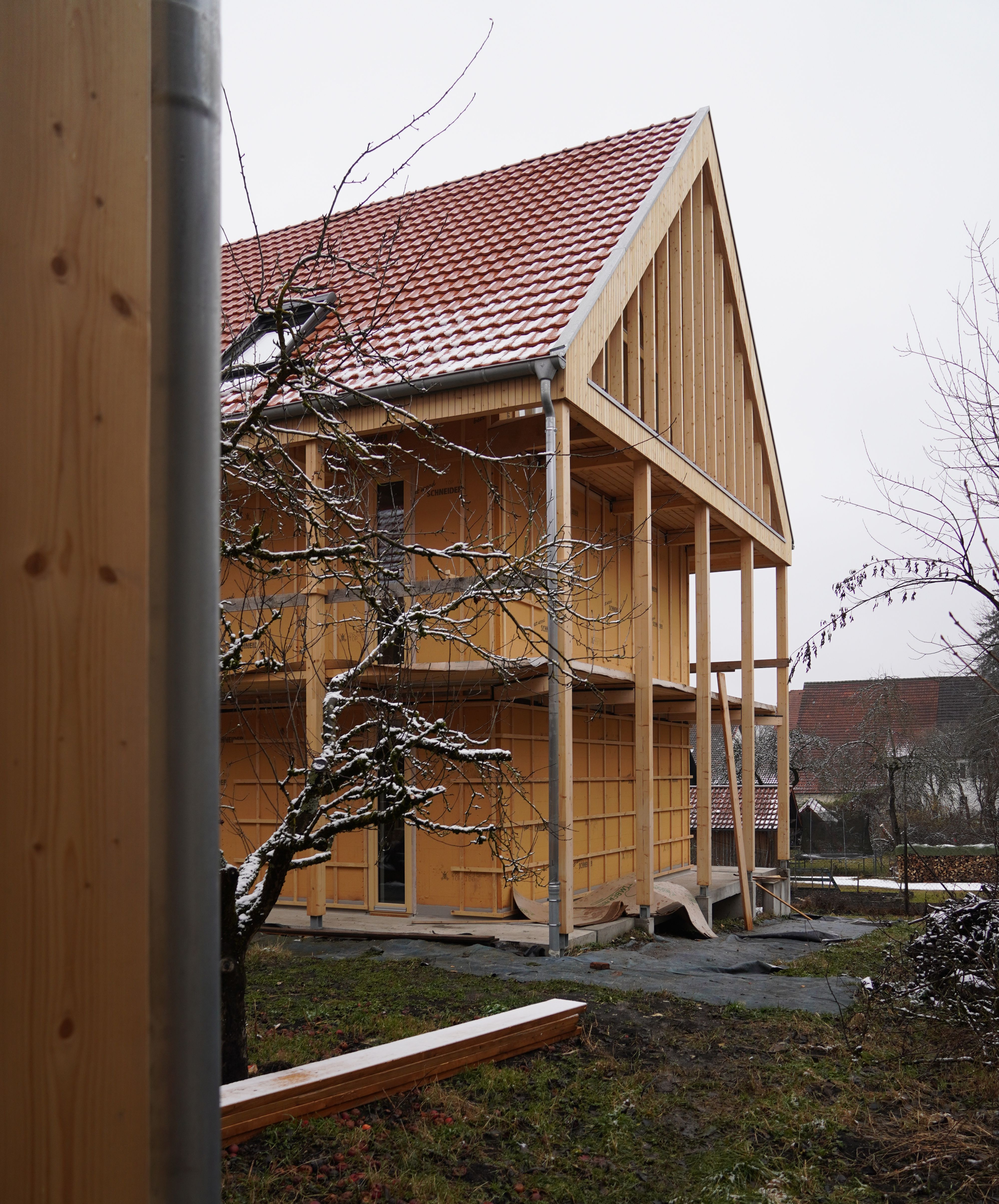 die konstruktion erfolgt in holzbauweise. diese materialwahl prägt das architektonische erscheinungsbild und erfüllt anforderungen an energieeffizienz und nachhaltigkeit.