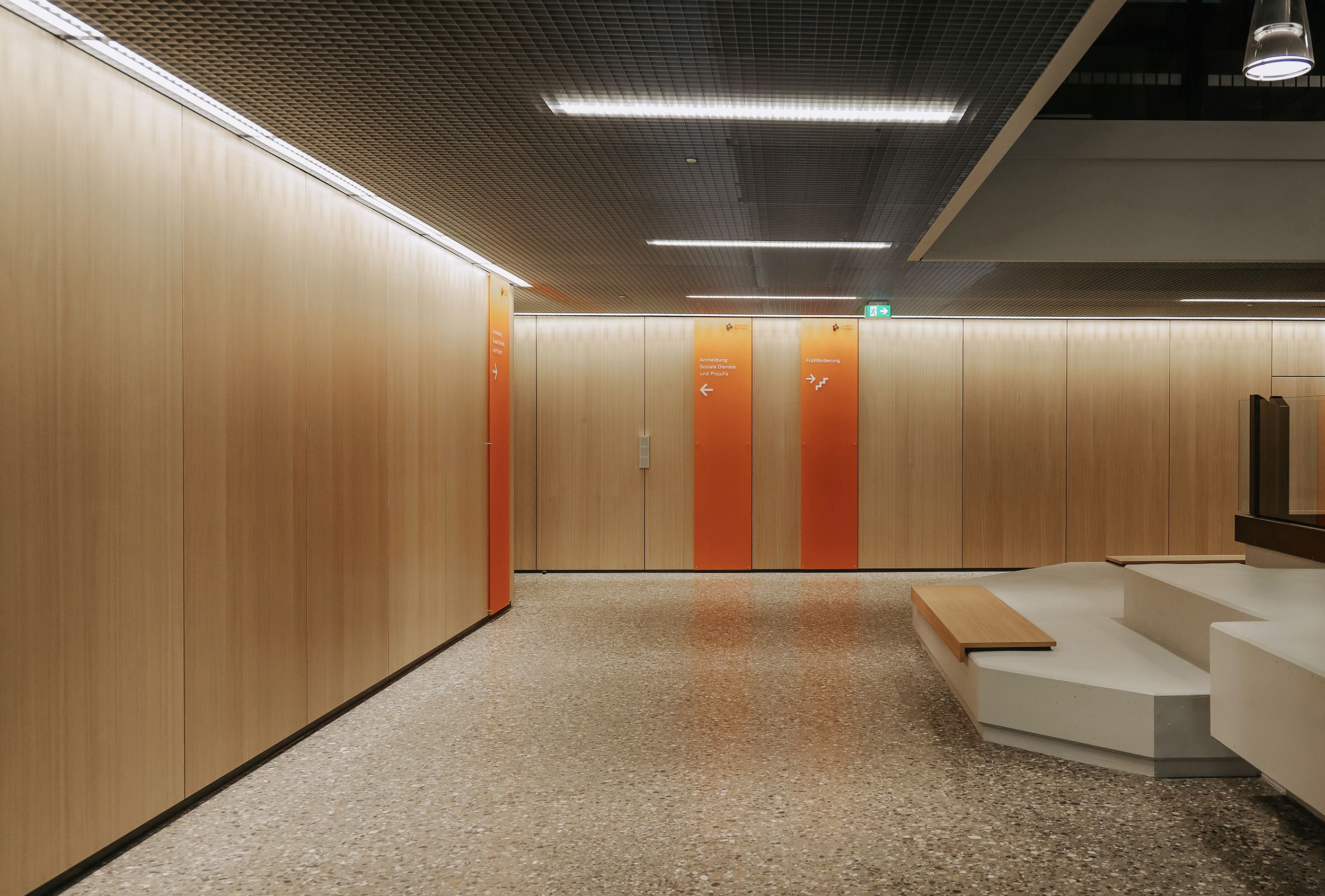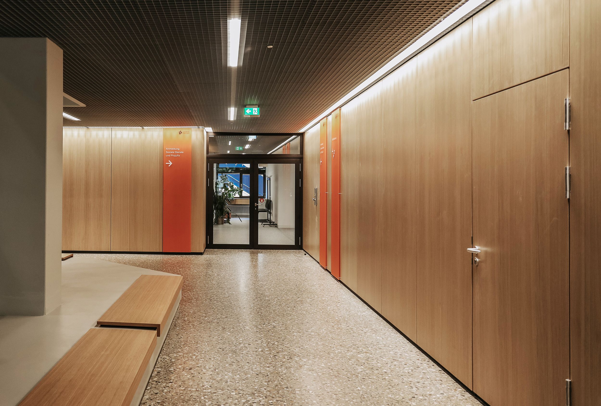 die planungs- und bauleistungen umfassten die umnutzung und neuorganisation von führerschein- und zulassungsstelle sowie des sozialen dienstes. außerdem wurden brandschutzmaßnahmen zur abtrennung der funktionseinheiten und des treppenhauses durch den einbau von brandschutzwänden und brandschutz-glastürelementen durchgeführt.