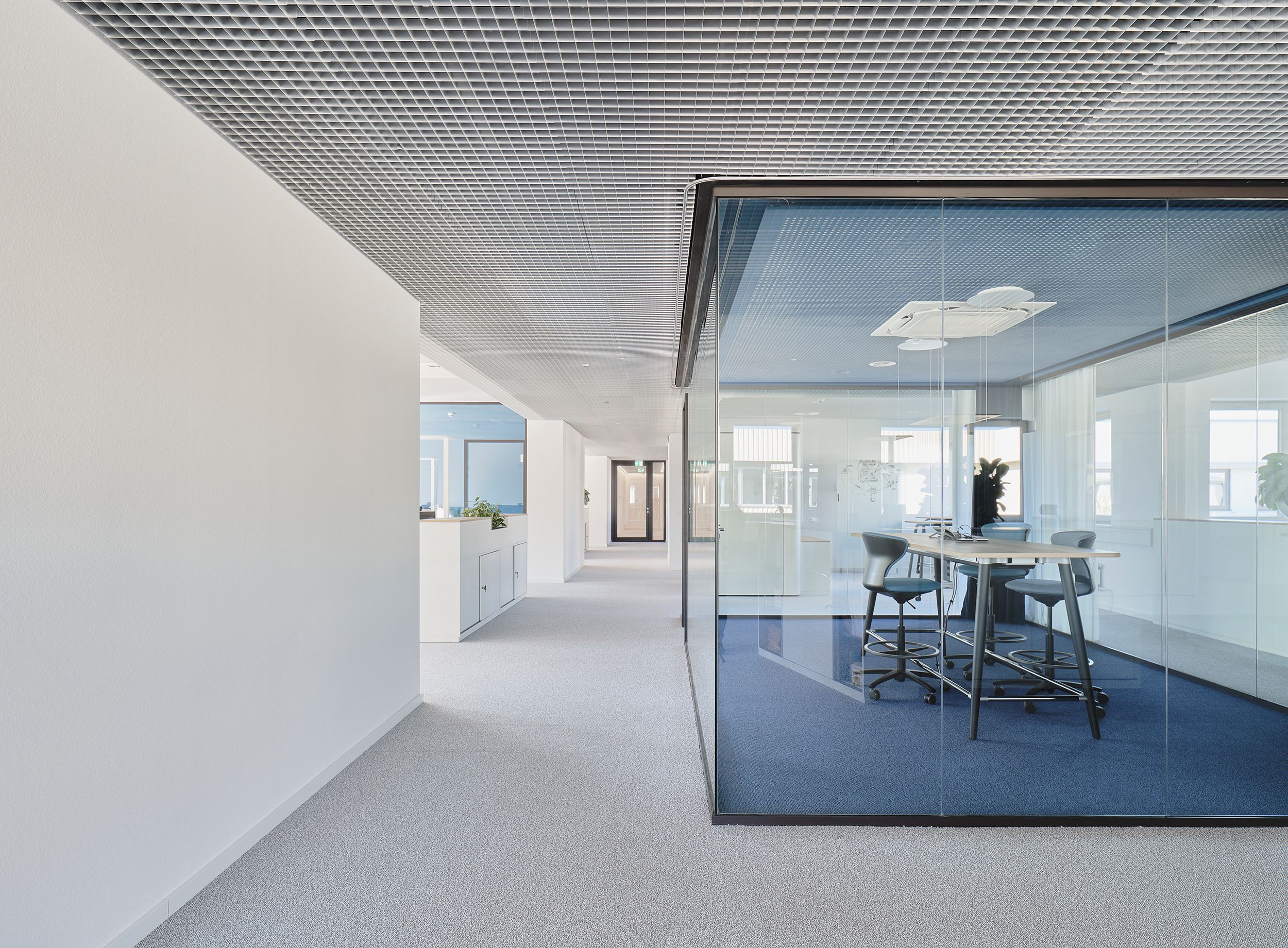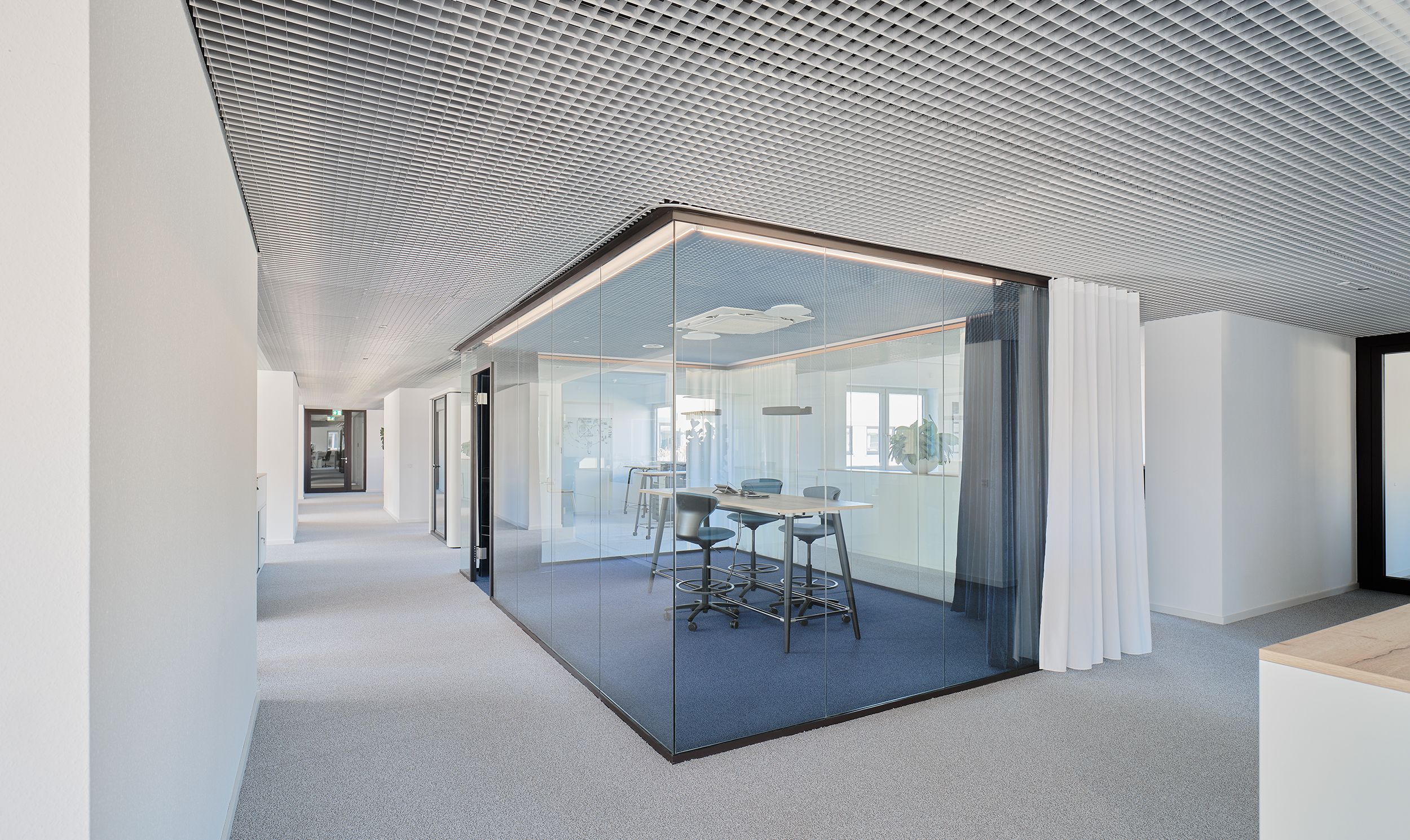 die mittelflurerschließung mit 2-bündig angeordneten zellenbüros wird in zonierte großraumbüros aufgelöst. die mäandernde anordnung der bürozonen schafft offene und trotzdem ruhige, überschaubare zonen für büroarbeitsplätze. die abgrenzung und zonierung wird durch eingestellte bürokuben für abteilungsleiter und meetingräume erreicht.